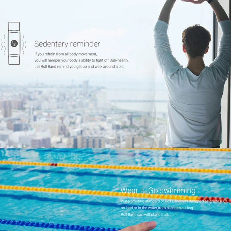 The curved bottom of the Roll Band can be snug against your skin, quite match ergonomics and offer comfortable training. Curved frame design, makes the visual thickness of Roll Band is breathtaking 5.6mm. Maybe we have to redefine smart band.