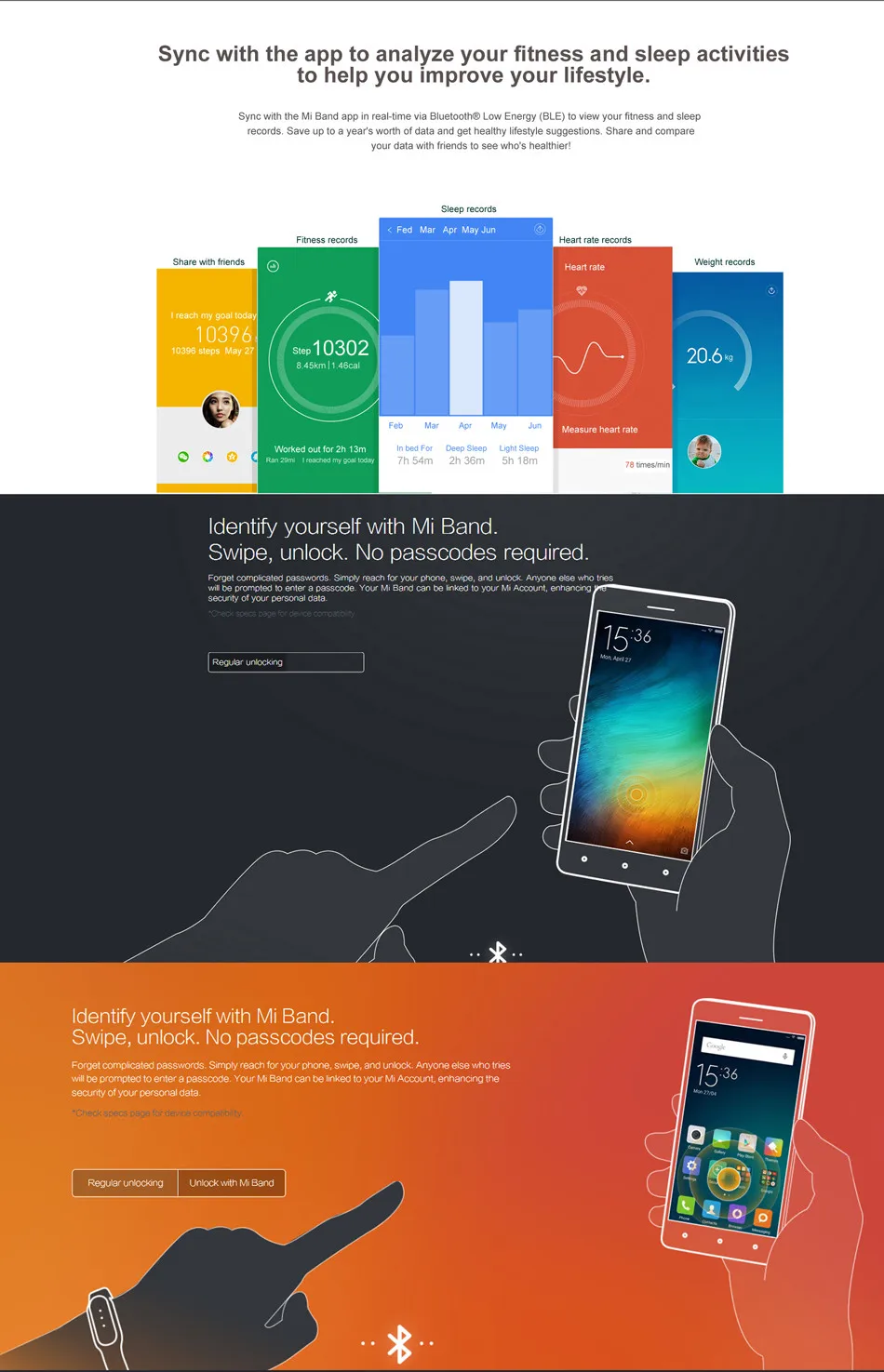 2 Note: Mi Band\'s phone unlocking feature requires smartphones with MIUI or Android 5.0 and above.